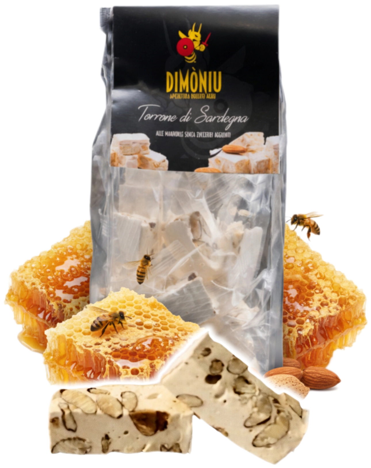Assolutamente privo di zuccheri aggiunti, un mix perfetto tra la delicatezza naturale del miele millefiori prodotto dalle nostre api, nelle campagne incontaminate della Sardegna centrale, precisamente nel territorio di Austis e il gusto intenso e croccante delle mandorle locali.
